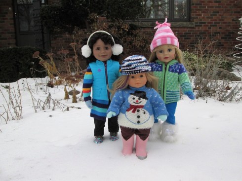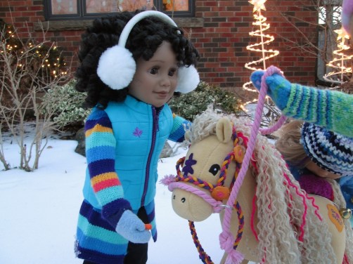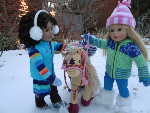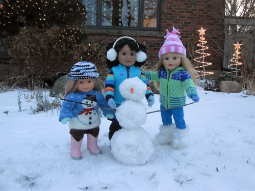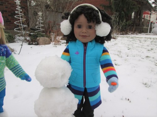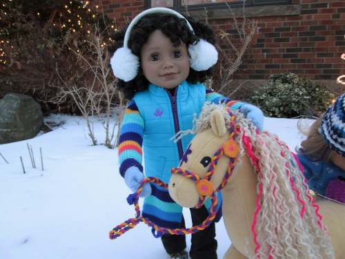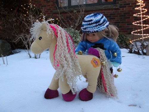 Anyway, have a great break, and if you like snow, I hope you get some! I sure have some, clearly, and then because I’ve still got my aircast on, I kept getting it in my toes while taking pictures . . . They were sooo cold by the end! Granted, my fingers were too, but at least it wasn’t too cold of a day. And hey, I got this post done before the end of the year! I really did want it done for Christmas, but then the 24th was super cold here (weather was bad, my grandparents didn’t end up coming until the next morning because of it) and I’ve been pretty busy since, but I got out yesterday to take these. I did it in the front yard and the people walking by were actually really nice! One stranger said the scene I had set up would make a great picture, another one had two dogs that wanted to play with the “American dolls” XD but she wasn’t going to let them. Never mind that it’s American GIRL dolls and that my dolls aren’t even those! She also asked if I was taking pictures or leaving the dolls out there . . . She was really nice though. Oh, and I saw my next-door neighbour, who also thought what I was doing was really sweet. I generally get pretty nervous taking doll pictures outside, especially ’cause I’m not exactly a kid anymore, but all the people who passed were really nice, so I probably don’t need to worry! :)